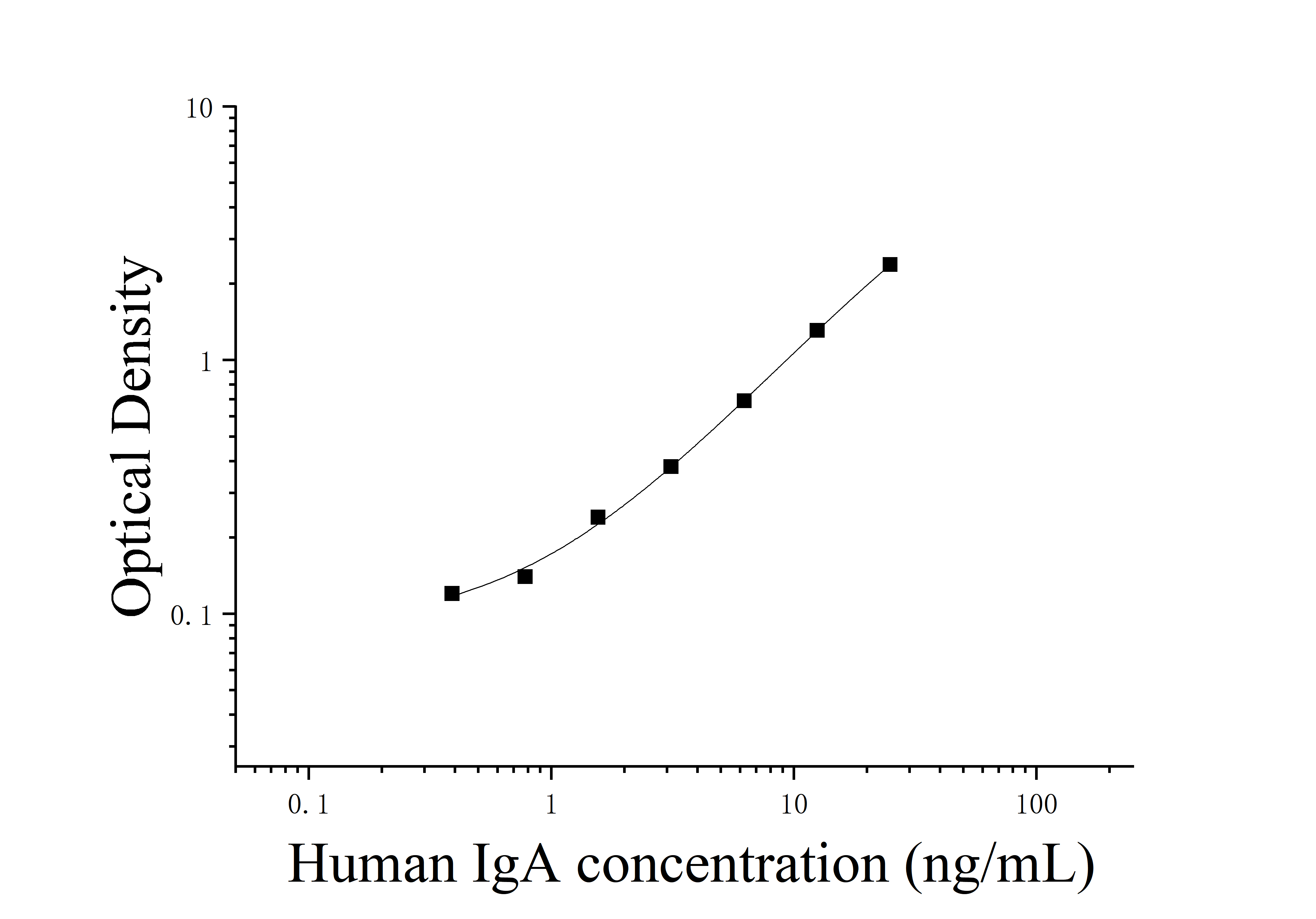 由于实验操作条件的不同( 如操作者、移液技术、洗板技术和稳定条件等),标准曲线的OD值会有所差异。以下数据和曲线仅供参考,实验者需根据自己的实验建立标准曲线。